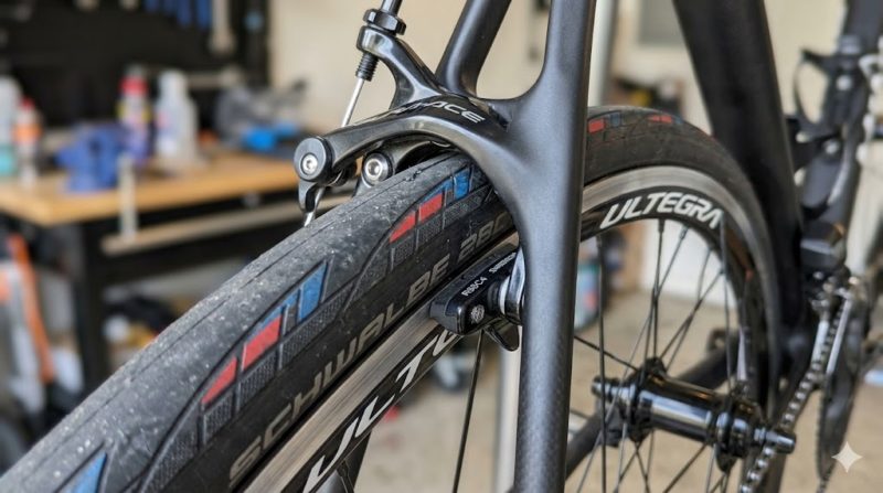 しかし、ここで気になるのが「むかし買った、古いリムブレーキのロードバイクに28Cの太いタイヤは履けるのか?」という問題です。リムブレーキ時代のフレームは、そもそも23Cや25Cを前提に設計されているため、フレームやブレーキキャリパーとタイヤが擦れてしまう(干渉する)リスクがあります。