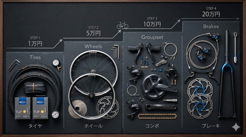 見た目重視でバーテープやペダルから入るのもアリですが、「もっと速く走りたい・楽になりたい」ならタイヤから始めてください。