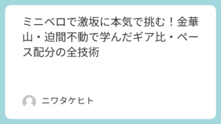 ミニベロ ミニベロで激坂に本気で挑む!金華山・迫間不動で学んだギア比・ペース配分の全技術 ミニベロでヒルクライムに挑む!金華山・迫間不動での実体験をもとに、ギア比の考え方・乙女ギアの効果・ペース配分のコツを徹底解説。スプロケット選びで坂が劇的に変わります。 2026.04.08 カスタムミニベロ
